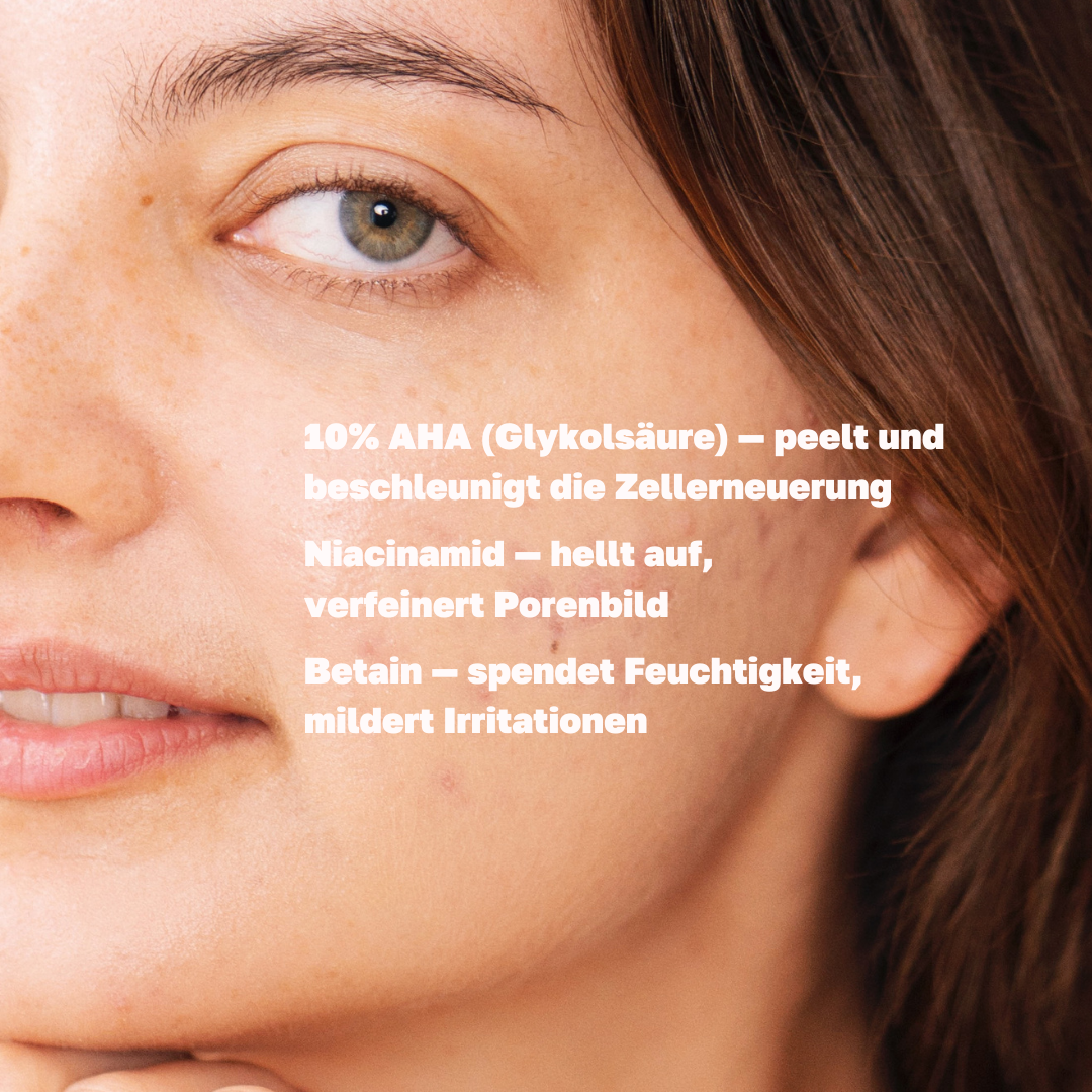 • 10% Glycolsäure: Stimuliert die Kollagenproduktion und sorgt für einen strahlenden Teint.
